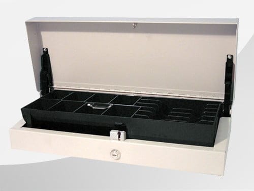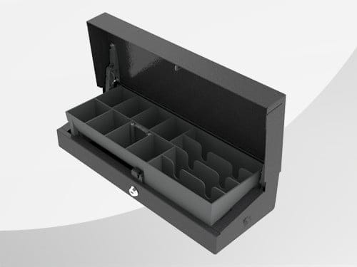Die FlipLid Die robuste und kompakte Bauweise der nach oben öffnenden Kassenlade hat sich über viele Jahre bewährt: Auf gerade einmal 460 x 180 x 100 mm verfügt die -CostPlus«-Variante über einen herausnehmbaren Kasseneinsatz mit acht Münzfächern und vier standardmäßigen Notenfächern, die individuell auf bis zu sechs erweiterbar sind.