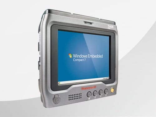 Prozessor: Texas Instruments 1,5 GHz OMAP 4470 Dual Core Prozessor Betriebssystem: Windows Embedded Compact 7 Entwicklungsumgebung: Thor CV31-SDK verfügbar Speicher: 1 GB RAM Datenspeicher: 16 GB Flash Speichererweiterung: microSD-Steckplatz für Speicherkarten bis max. 32 GB Tastatur: 4 Funktionstasten programmierbar Display: 6,5" VGA (640 x 480) LED-Display mit Hintergrundbeleuchtung, 600 NIT, Industrietauglicher resistiver Touchscreen, Bedienung per Hand oder Stift Audio: Stereo-Ausgabe (Klinke, 4-polig); Mikrofoneingang (PTT); integrierte Lautsprecher für Benachrichtigungen Schnittstellen: 2 serielle Standardanschlüsse (DB9); 2 USB 2.0 Host-Anschlüsse (DB15-Kabel mit Schraubverbindung erforderlich); 1 USB-Client für Windows-Gerätecenter (DB15-Kabel erforderlich); 1 x Ethernet 10/100 (RJ45) WLAN: IEEE 802.11a/b/g/n, WPA/WPA2 WPAN: Bluetooth Power Class 1.5, Version 4 BLE NFC: Automatische Bluetooth-Kopplung mit TouchConnect und Stimmprofil-Synchronisation mit Vocollect VoiceCatalyst-Software und SRX2-Headset Abmessung: B x H x T 189 x 176 x 56 mm Gewicht: 1,5 kg Stromversorgung: DC Input Voltage: 12 VDC Backup-Batterie (30 Minuten Akku-Kapazität bei -20°C) Betriebstemperatur: -20°C bis 50°C Vibrationen: MIL-STD-810G, Methode 514.6, Verfahren 1 Schutzklasse: IP66 staubdicht & strahlwassergeschützt